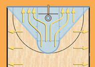 The diagram above shows where the ball should be put in play for those frequent instances that require a “nearest spot” throw-in. These include common fouls prior to the bonus, violations and held balls. The blue area goes to the end line and the pink area goes to the sideline.
